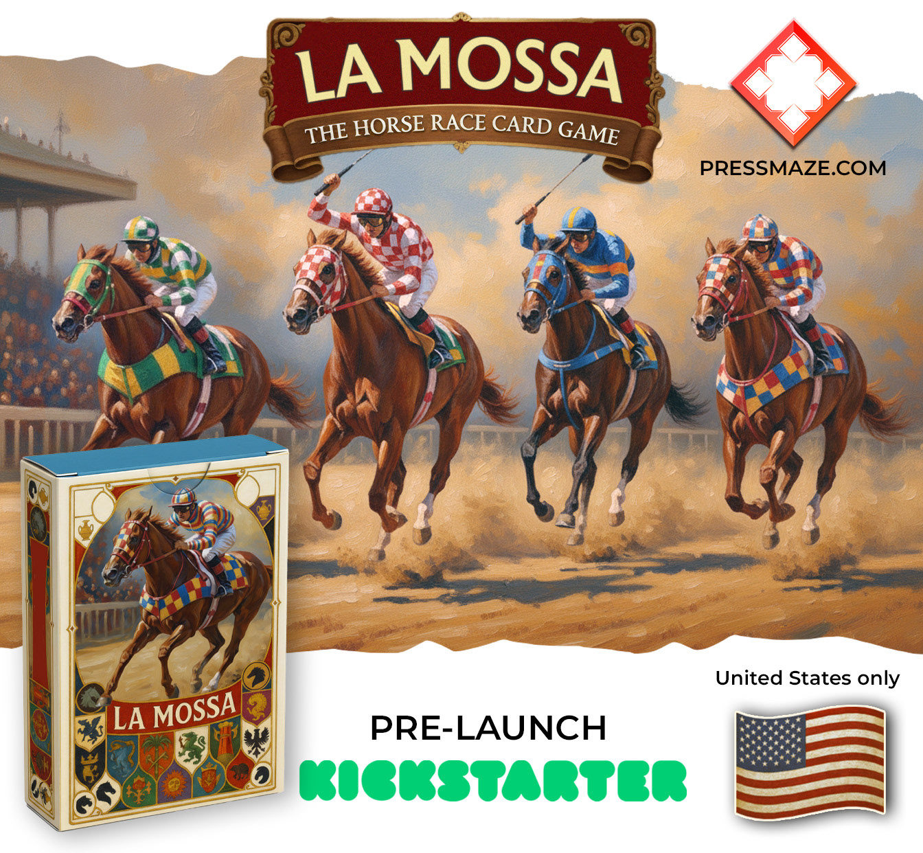 La Mossa è una reinterpretazione con stile retrò di un gioco di carte antichissimo, oggi viene riproposto per il mercato americano con una illustrazione anni 40 e nuove possibilità di gioco. Il progetto è stato sviluppato da Luca Prestipino per Pressmaze.com, curando sia l’intero comparto grafico sia le attività di pre-lancio su Kickstarter.