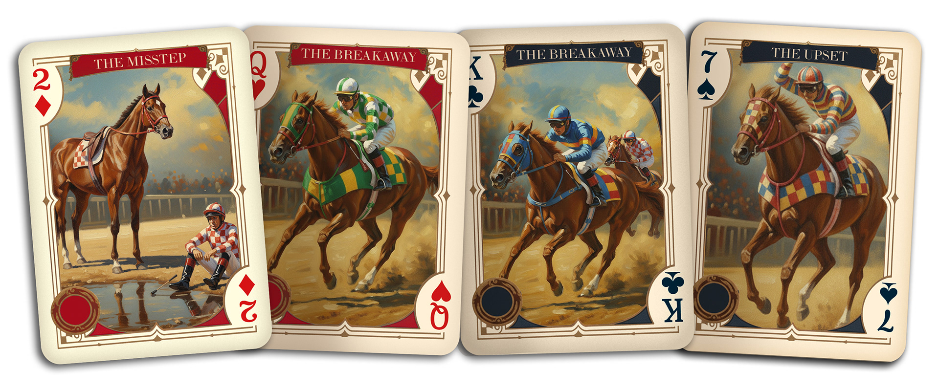 Il gioco viene distribuito in formato deck standalone su DriveThruCards, disponibile inizialmente solo per il mercato statunitense. Le carte sono la rappresentazione delle varie fasi di una corsa dei cavalli, con varianti per colpi di scena pungenti.